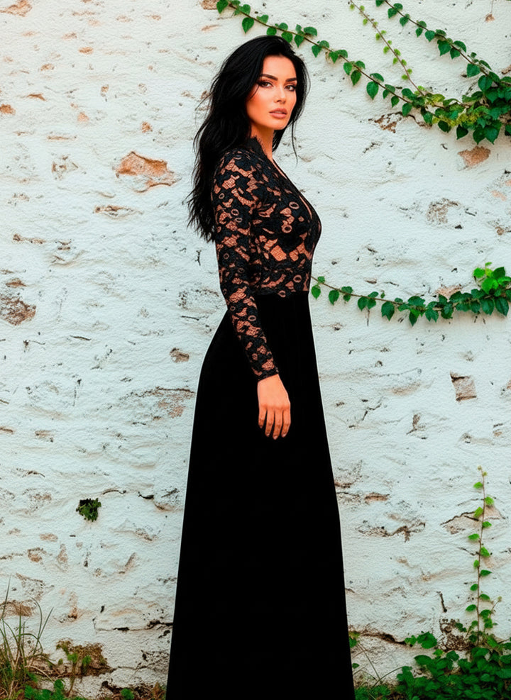 Vestido Largo de Fiesta Negro con Encaje Floral