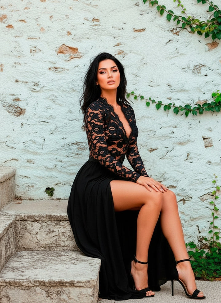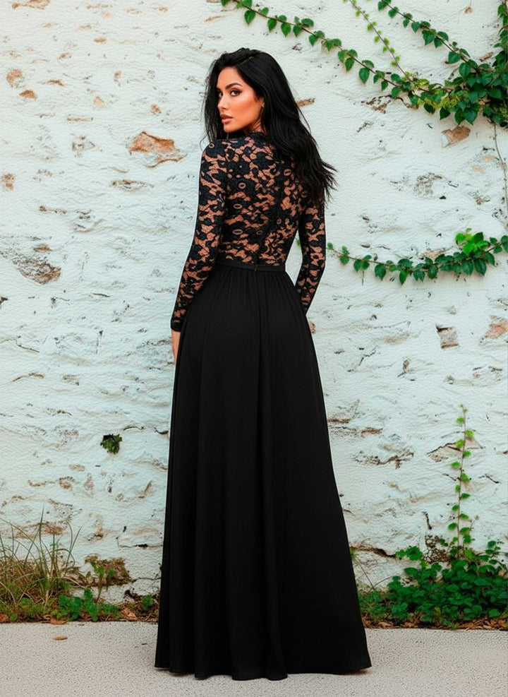 Vestido Largo De Fiesta con Encaje Negro Cuello V y Abertura Lateral